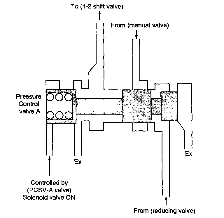 Pressure control valve A, B regulate the pressure supplied to each clutch under the control of the pressure control solenoid valve A, B to eliminate shock at the time of shifting.