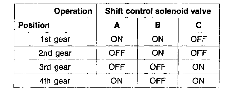 The relationship of the shifting gear and the ON-OFF switch of shift control solenoid valve "A", "B" and "C" are shown in the table.