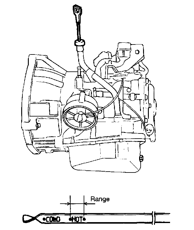 4. Before removing the dipstick, wipe all contaminants from around the dipstick. Then take out the dipstick and check the condition of the fluid. The transaxle should be overhauled under the following conditions.