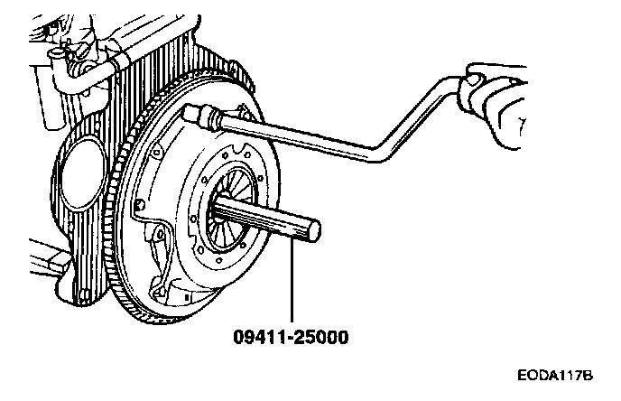 6. Using the special tool (09411-25000), install the clutch disc to the flywheel. When installing the clutch disc, be sure that the surface having the manufactures stamp is towards the pressure plate.