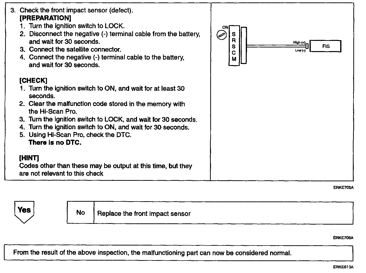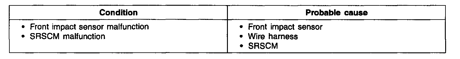 The release system for the airbag consists of the SRSCM and front impact sensor. The above DTC are recorded when a there is defect or communication error of the front impact sensor in the front impact sensor circuit.