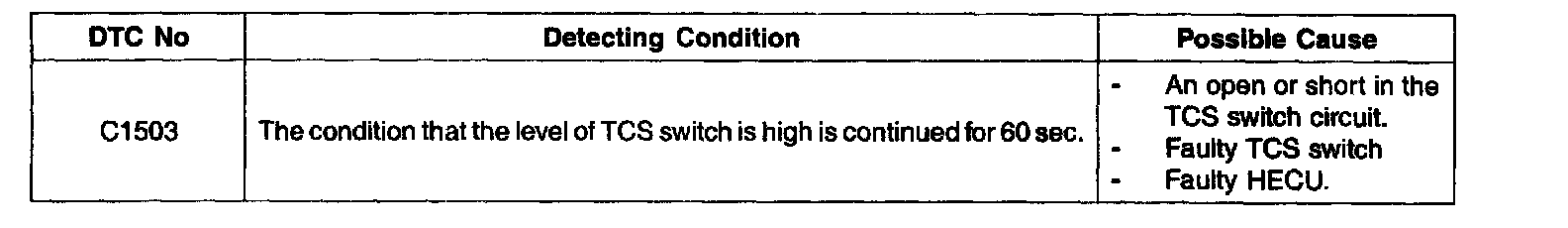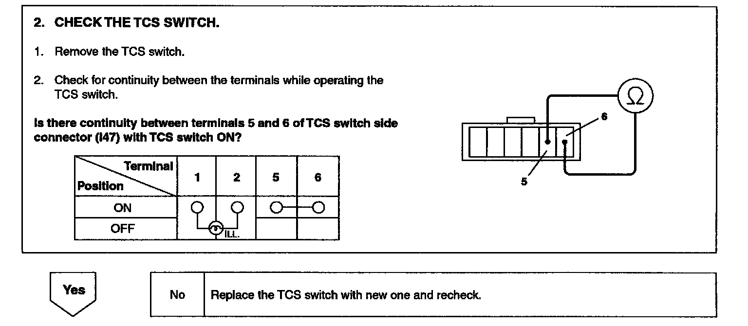 When the TCS switch is pressed, TCS control is deactivated and the TCS OFF indicator lights up. The TCS OFF indicator turns "ON" when the HECU prohibit TCS controls.