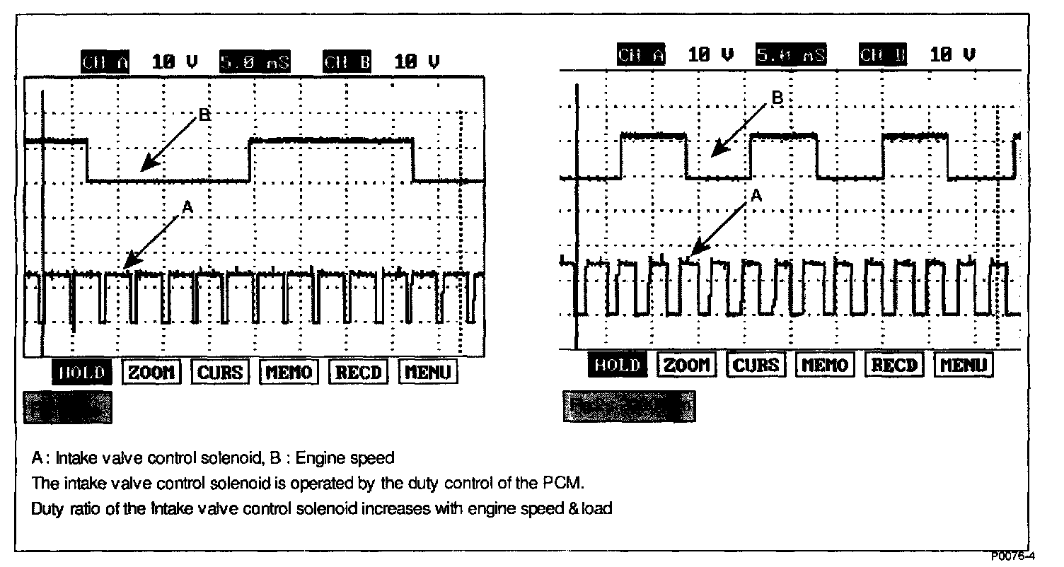 The CVVT (Continuously Variable Valve Timing) system built on the camshaft helps the engine decrease the exhaust gas and increase engine power and fuel economy by changing the valve open/close timing of the intake camshaft continuously. The intake valve control solenoid, the main control part of the CVVT, changes the direction of the oil path through the CVVT by the duty control of the PCM and changes the open and close timing of the intake and exhaust valves.