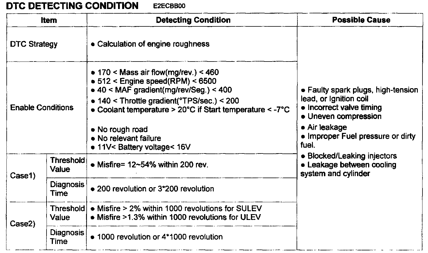 The PCM must monitor the engine for misfiring possibly caused by ignition coil defects or injector fails. If misfiring is detected, the PCM will identify the cylinder(s) that has(have) misfired and then calculate misfiring rate for a given duration. The DTC for Misfire (P0301. to 0304) is set as soon as the misfiring rate exceeds the limit which may result in damage to the catalyst or increase emissions The PCM stores the individual DTC for a cylinder which has more than a 10% total misfire rate.