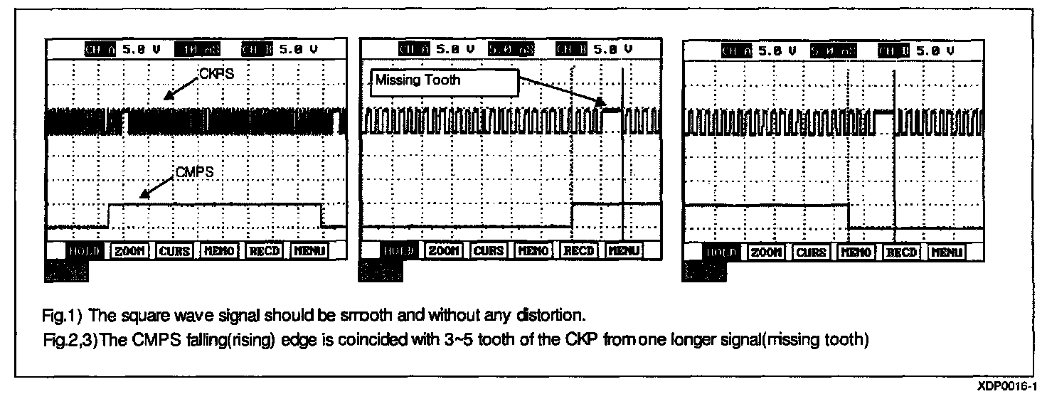 2. Start the engine and check for signal waveform whether synchronize with camshaft sensor or not and tooth is missing refer to sample waveforms as above.