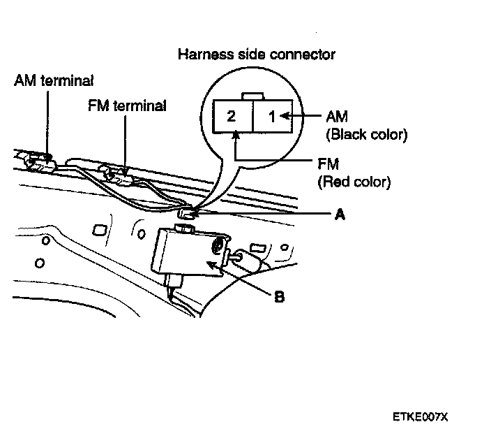 4. Check for continuity between terminals of harness side connector (A) and antenna grid terminals (AM, FM).