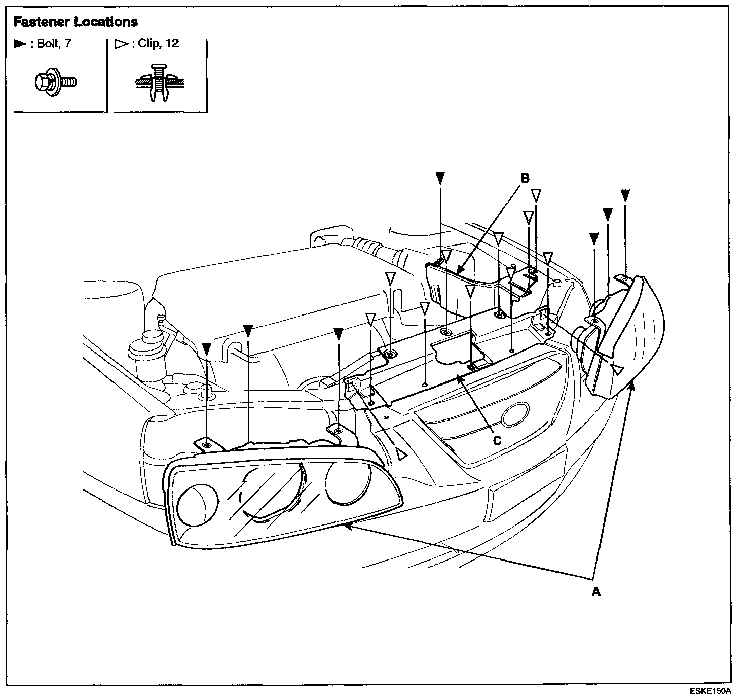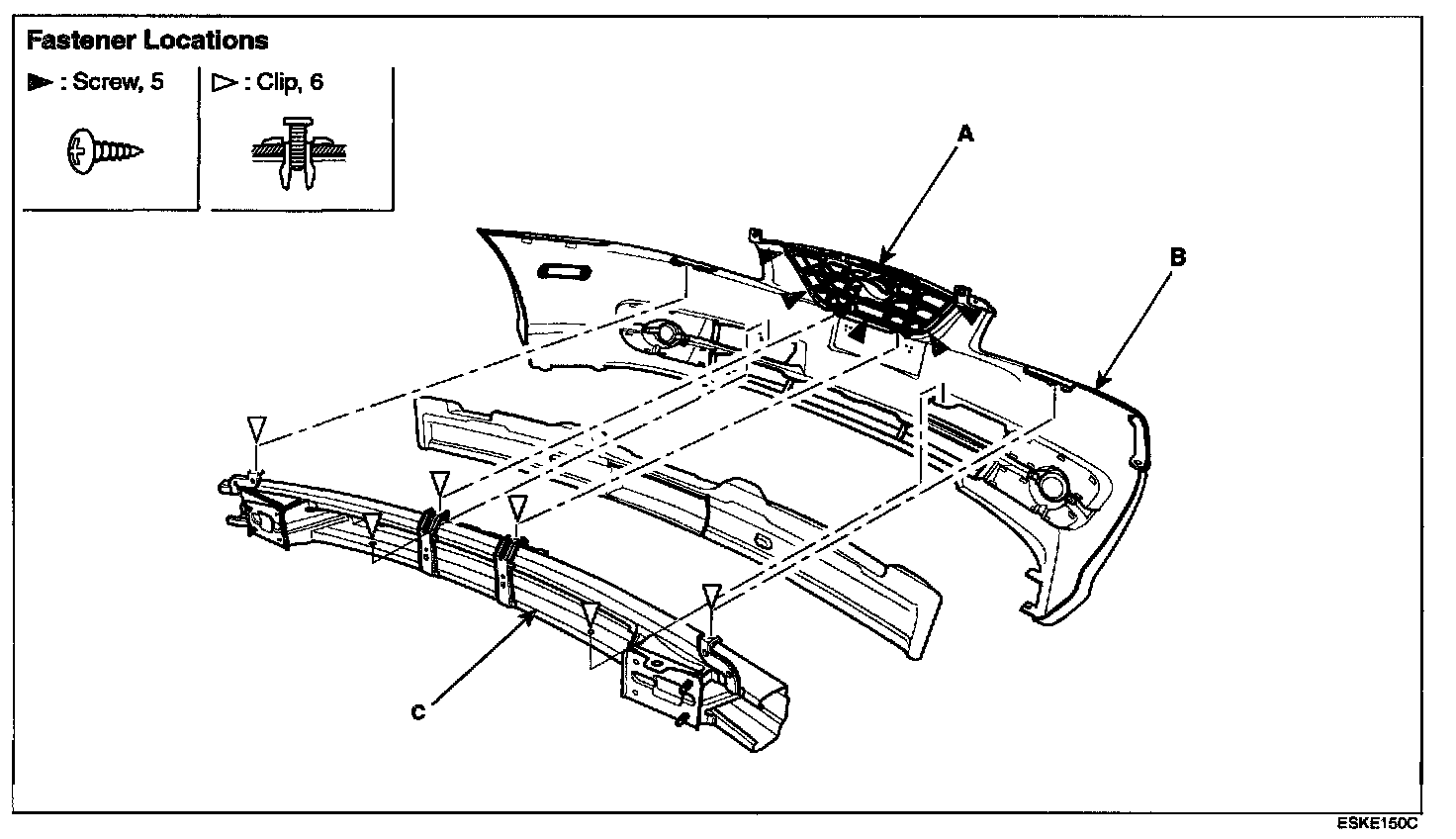 4. After removing the radiator grille (A), disconnect the cover (B) and rail (C).