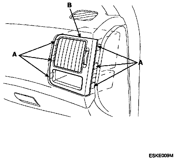 PASSENGER'S SIDE VENT REMOVAL AND INSTALLATION1. Wrap a flat-tip screwdriver with protective tape, and apply protective tape around the related parts to prevent damage. Carefully insert a flat-tip screwdriver next to the clip, and detach the clips (A) by prying on the passenger's side vent (B). Take care not to scratch the crash pad and related parts.