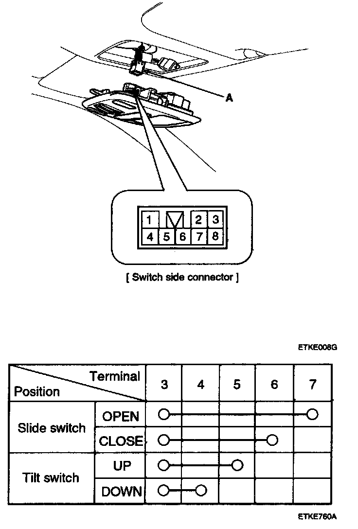 3. Disconnect the 8P connector (A) then remove the overhead console lamp assembly from the headliner. Check for continuity between the terminals. If the continuity is not as specified, replace the sunroof switch.