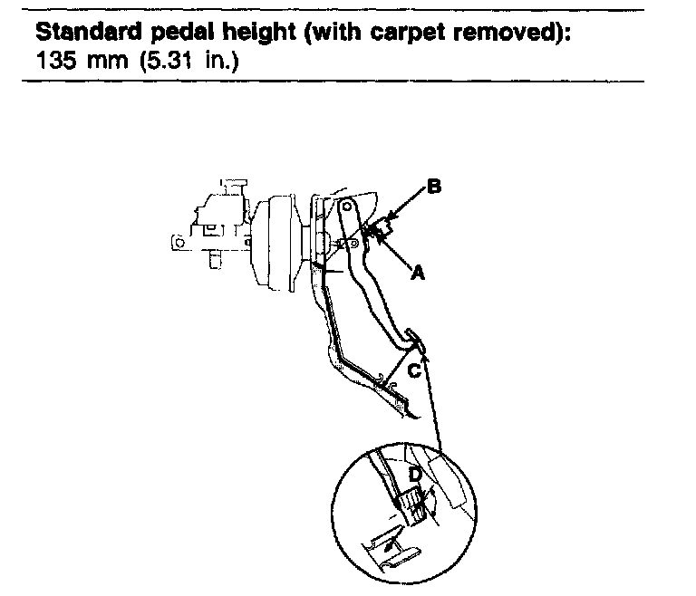 2. Lift up the carpet. At the insulator cutout, measure the pedal height (C) from the middle of the left-side center of the pedal pad (D).