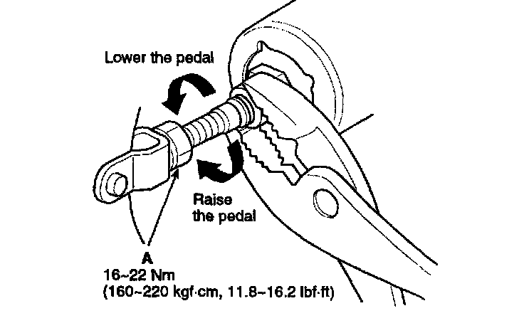 3. Loosen the pushrod locknut (A), and screw the pushrod in or out with pliers until the standard pedal height from the floor is reached. After adjustment, tighten the locknut firmly. Do not adjust the pedal height with the pushrod depressed.