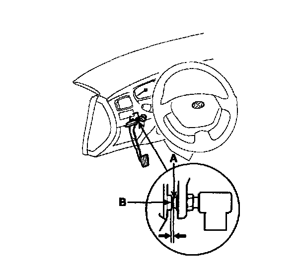 1. With the engine off, inspect the pedal free play (A) on the pedal pad (B) by pushing the pedal by hand.
