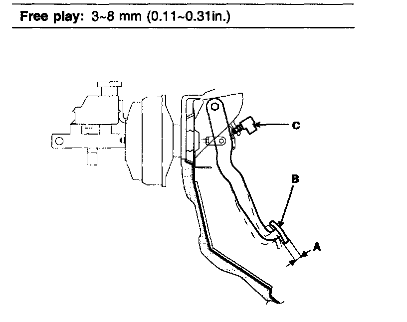2. If the pedal free play is out of specification, adjust the brake switch (C). If the pedal free play is insufficient, it may result in brake drag.