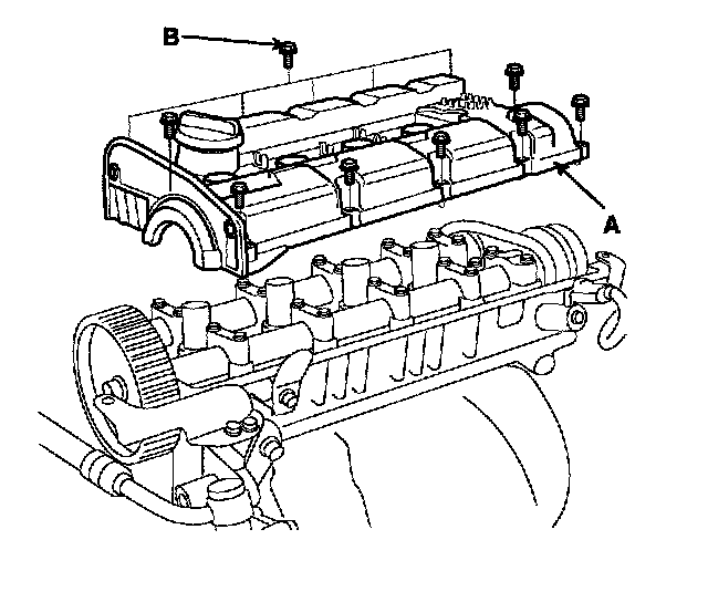 d. Loosen the cylinder head cover bolts (B) and then remove the cover (A) and gasket.