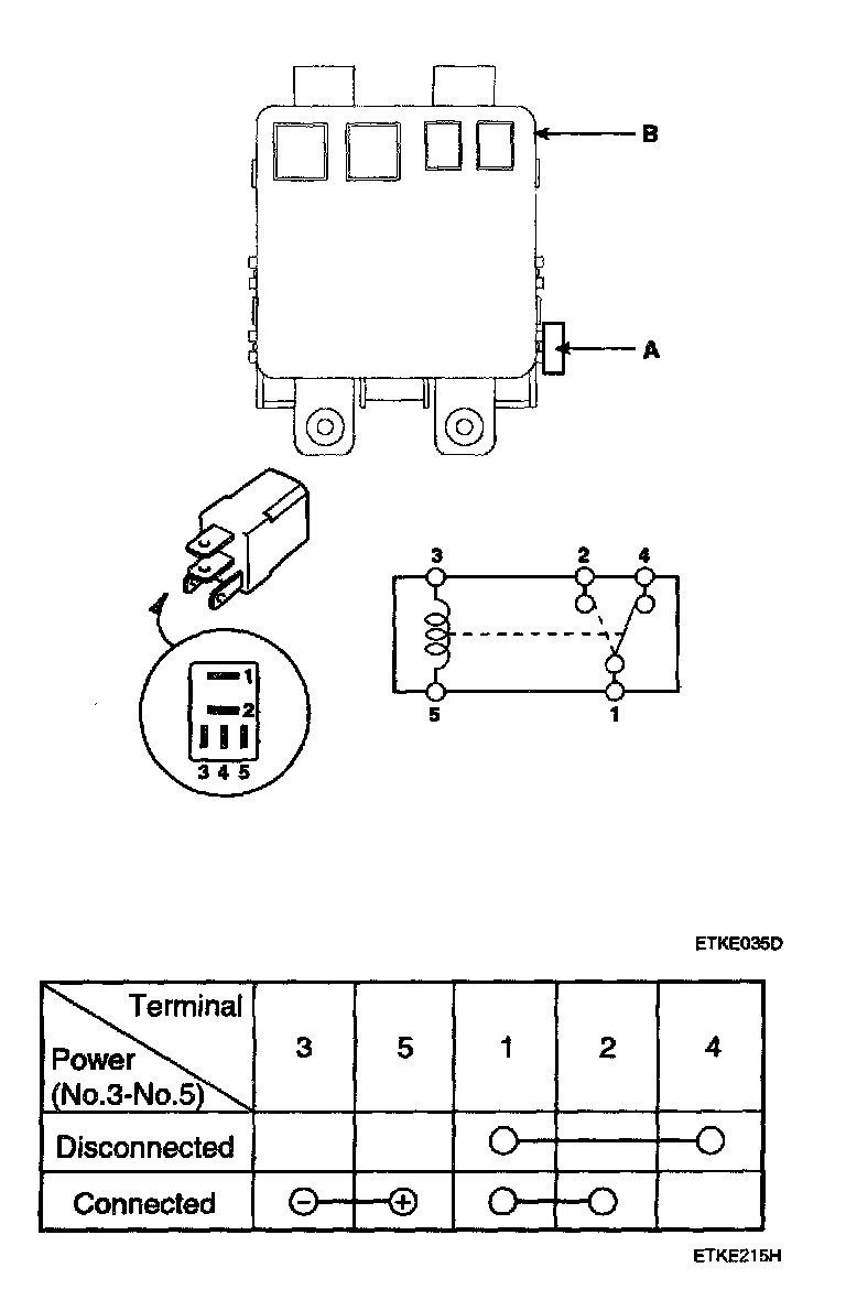 2. There should be continuity between the No.1 and No.2 terminals when power and ground are connected to the No.5 and No.3 terminals.