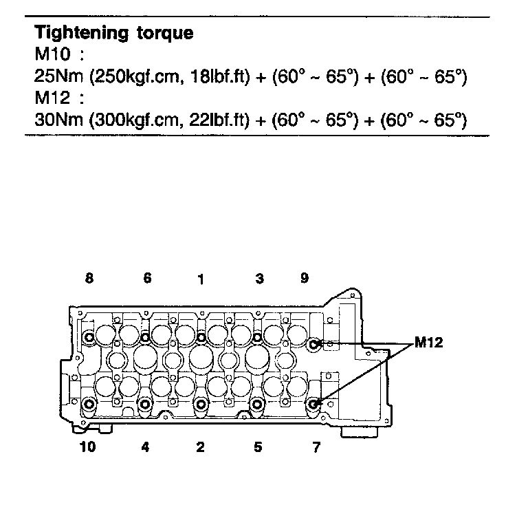 Using 8 mm and 10 mm hexagon wrench, install and tighten the 10 cylinder head bolts and plate washers, in several passes, in the sequence shown.