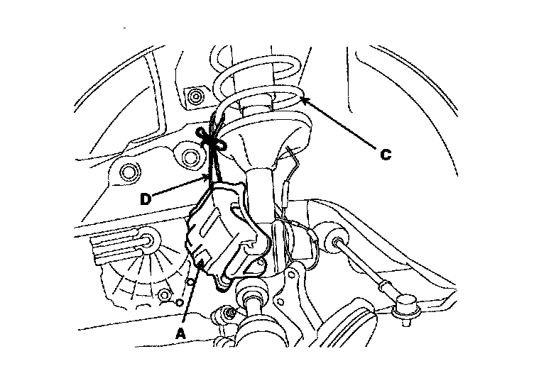 3. Remove the caliper(A) from the knuckle(B) and hang the caliper(A) on the front damper(C) with wire(D).