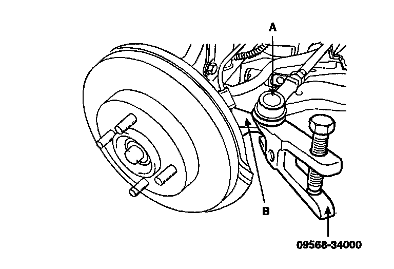 5. Disconnect the tie rod end ball joint(A) from the knuckle(B) using the special tool(09568-34000).