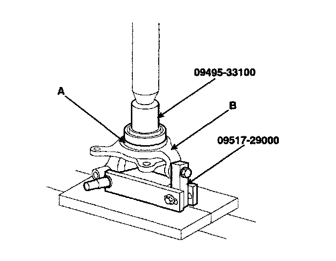 7. Using the special tools (09495-33100, 09517-29000), remove the wheel bearing outer race(A) from the knuckle(B).
