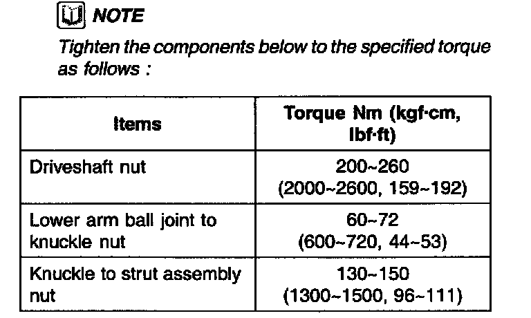 Specified torque Nm (kgf-cm, ft. lbs.) 200 - 260 (2000 - 2600, 159 - 192)