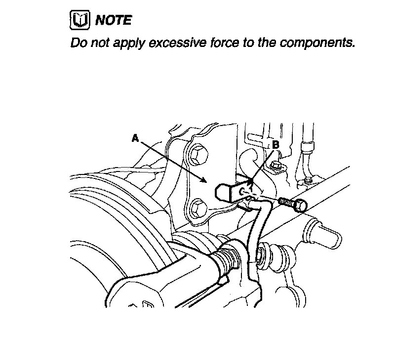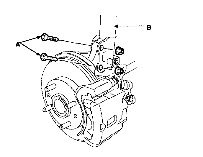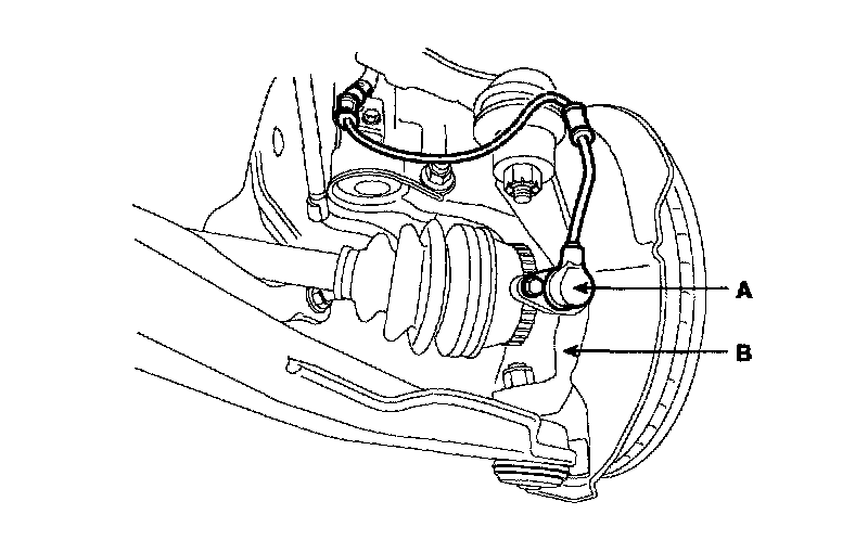3. In case of the vehicles equipped with Anti-lock Brake system, remove the wheel speed sensor(A) from the knuckle(B}.