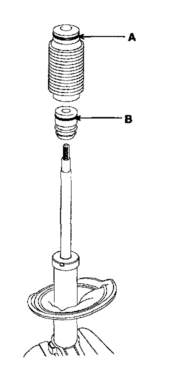 2. Install the strut dust cover(A) and rubber bump(B) to piston rod.