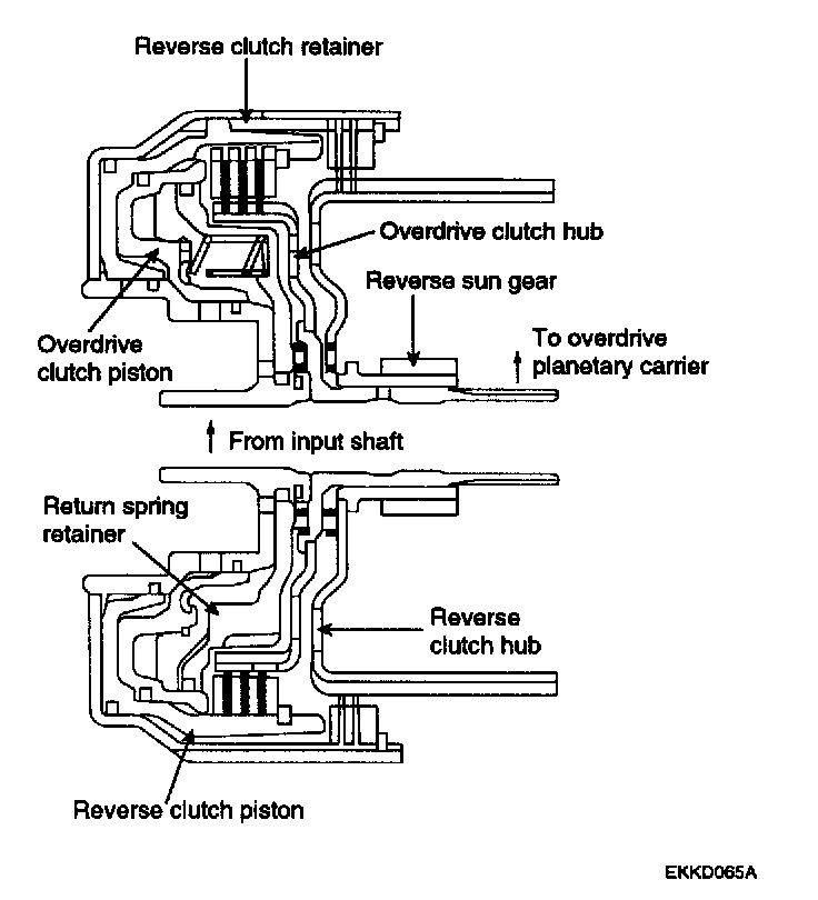 The overdrive clutch operates in 3rd and 4th gears and transmits driving force from the input shaft to the overdrive planetary carrier and low-reverse annulus gear.
