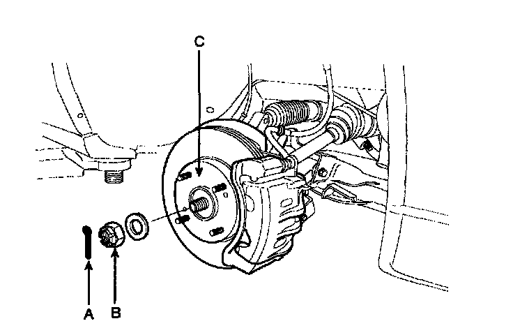 25. Remove the pin (A) and hub nut (B) from the front axle(C).