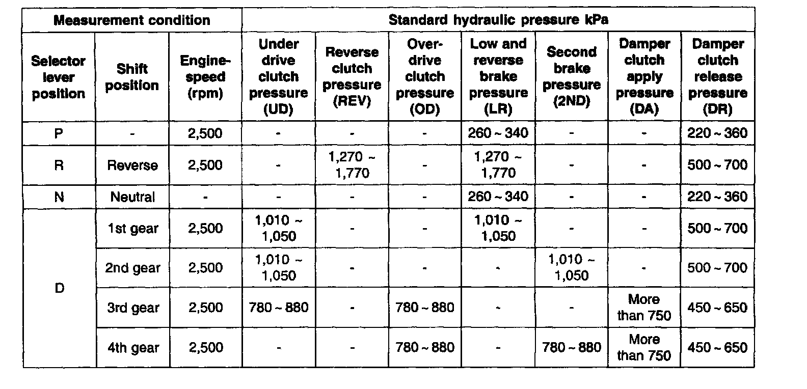 HYDRAULIC PRESSURE TEST DIAGNOSIS TABLE