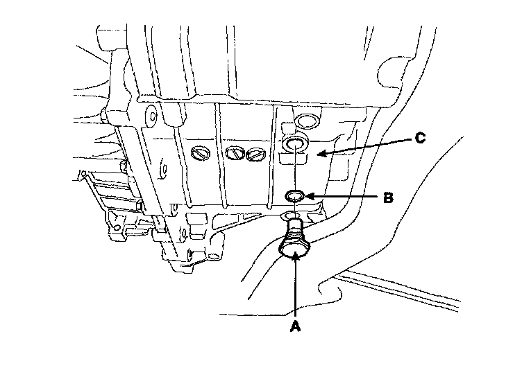 b. Remove drain plug(A) and washer(B) in the lower part of transaxle(C).