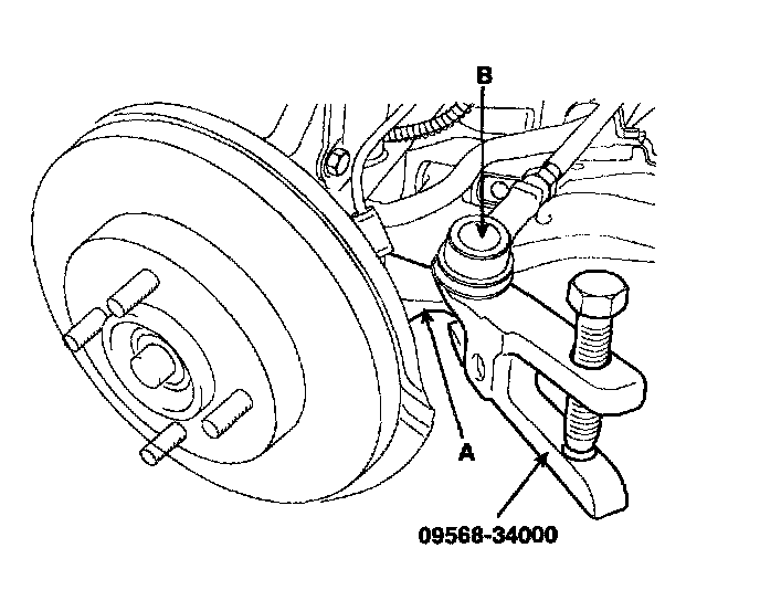 6. Disconnect the tie rod end ball joint(B) from the knuckle(A) using the Special Tool (09568-34000) after removing the split pin and castle nut.