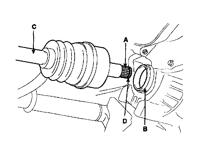 ^ Do not pull the driveshaft by excessive force it may cause components inside the BJ or TJ joint (C) kit to dislodge resulting in a torn boot(E) or a damaged bearing.