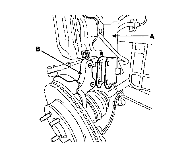 7. Remove the bolts (A, B) connected the knuckle among 3 wheel speed sensor mounting bolts (A, B, C).