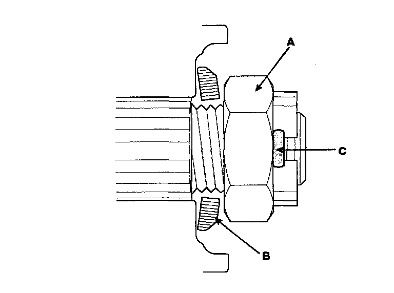 10. After installing the washer(B) with convex surface outward, install the castle nut(A) and the split pin(C).