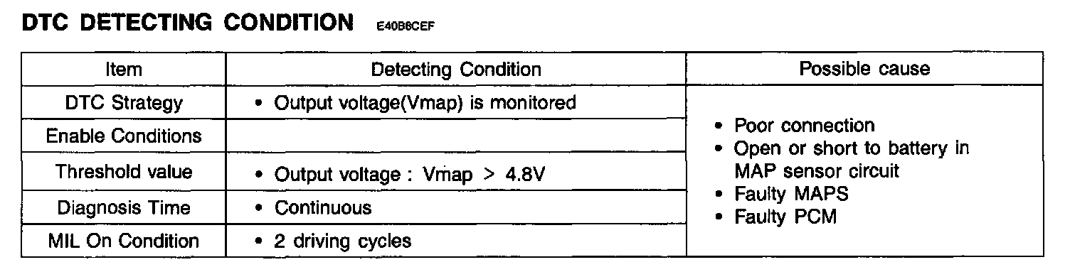 If MAP sensor output voltage is higher than 4.8 volts, the PCM determines that a fault exists and a DTC is stored.