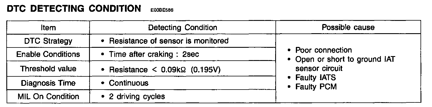 If the value of IAT sensor is lower than threshold, the PCM determines that a fault exists and a DTC is stored.