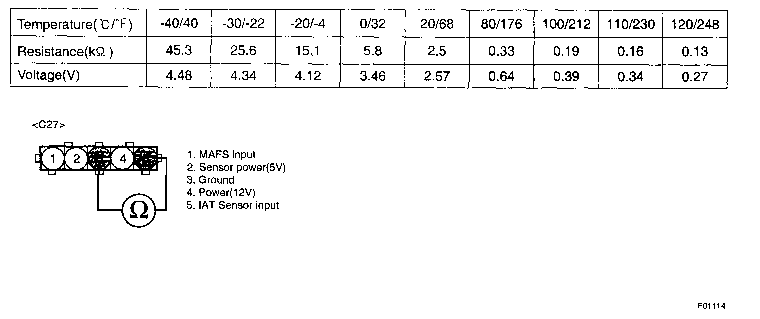 The Intake Air Temperature (IAT) sensor measures the temperature of engine intake air. The Intake Air Temperature (IAT) sensor is a thermistor (a variable resistor that changes along with outside air temperature) in series with a fixed resistor in the PCM. The PCM applies 5 volts to the IAT sensor. The PCM monitors the voltage across the IAT sensor and converts it into a temperature reading. When the outside air temperature is cold the IAT sensor resistance is high, and when the outside air temperature is warm the IAT sensor resistance is low. Therefore, when the air temperature is cold the PCM will receive a high voltage input, and when the air temperature is warm the PCM will receive a low voltage input. The signal from IAT sensor is used for injection time correction (Cold post start correction), ignition angle correction(Air temperature correction) and idle speed correction(Air-density correction).