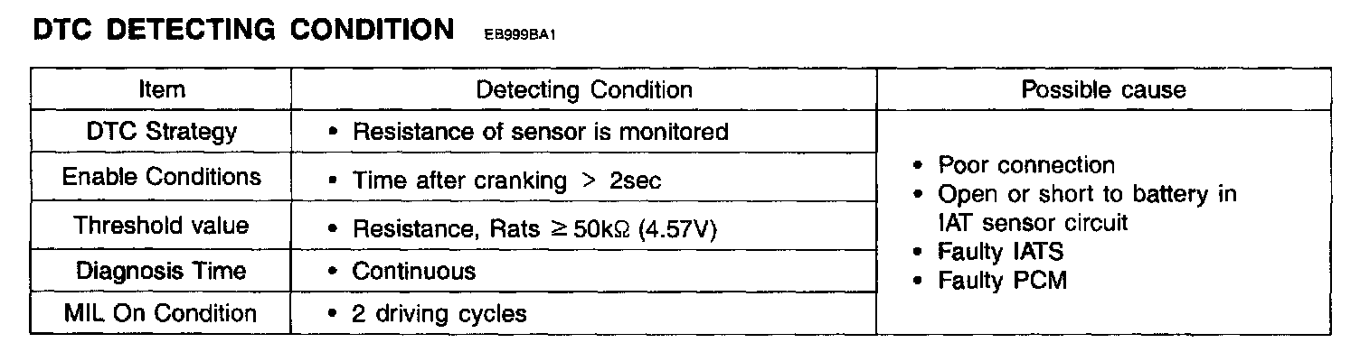 If the value of IAT sensor output is higher than 50 kOhms the PCM determines that a fault exists and a DTC is stored.