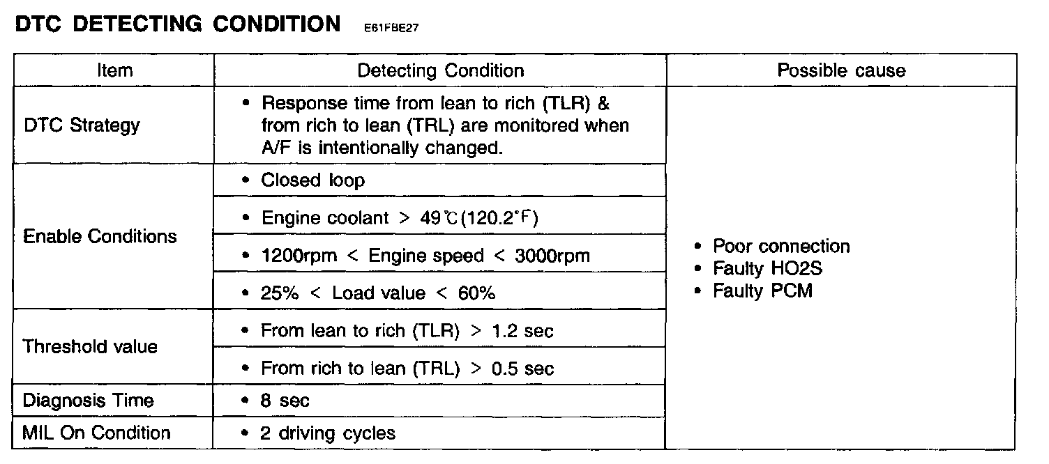 If the HO2S signal's response time from lean to rich is longer than 1.2 seconds or from rich to lean is longer than 0.5 seconds, the PCM determines that a fault exists and a DTC is stored.