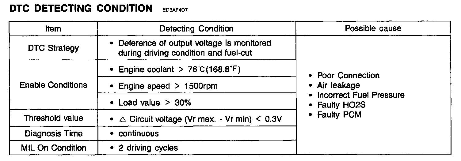 If the change of the rear HO2S signals is less than 0.3V during driving condition and fuel-cut, the PCM determines that a fault exists and a DTC is stored.