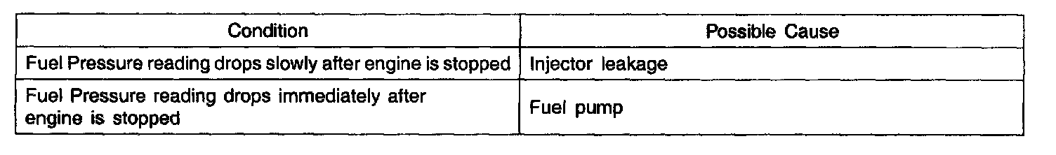 2. Stop the engine and check for a change in the fuel pressure gauge reading for 5 minutes.