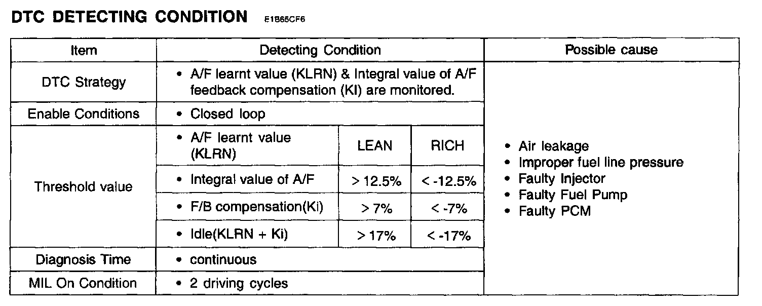 If long-term and short-term values are out of threshold value, the PCM determines that a fault exists and a DTC is stored.