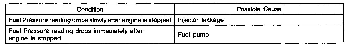 2. Stop the engine and check for a change in the fuel pressure gauge reading for 5 minutes.