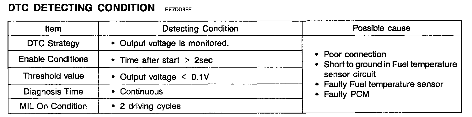 If fuel temperature sensor's signal is less than 0.1 V after starting, the PCM determines that a fault exists and a DTC is stored.