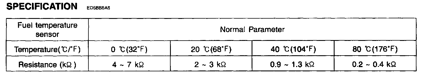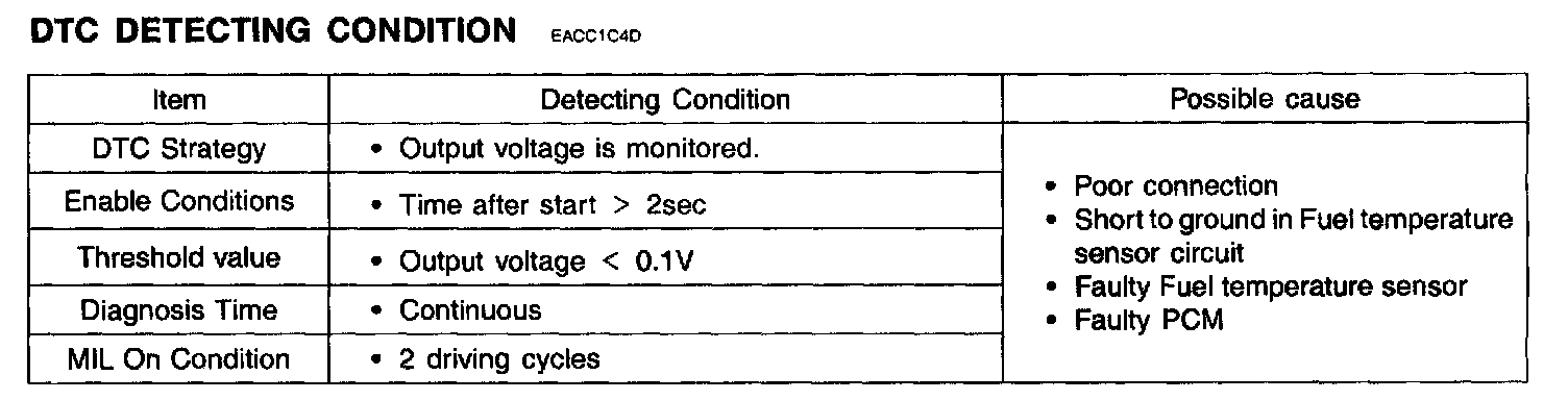 If fuel temperature sensor's signal is less than 0.1 V after starting, the PCM determines that a fault exists and a DTC is stored.