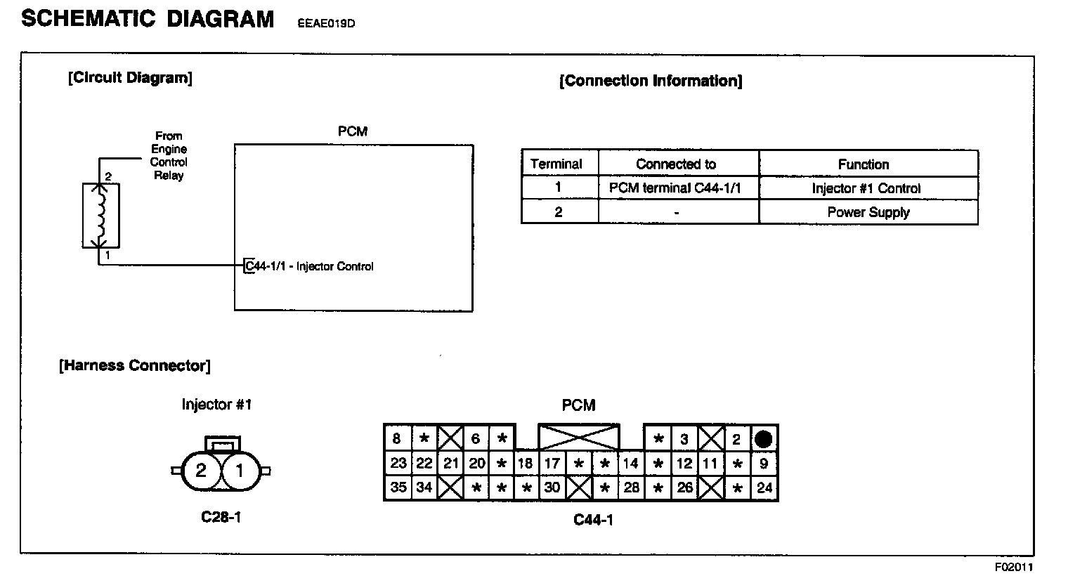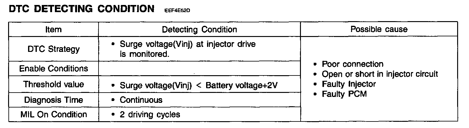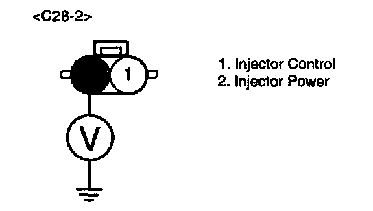Based on information from various sensors, the PCM measures the fuel injection amount. The fuel injector is a solenoid- operated valve and the fuel injection amount is controlled by length of time the fuel injector is held open. The PCM controls each injector by grounding the control circuit. When the PCM energizes the injector by grounding the control circuit, the circuit voltage should be low (theoretically 0 V) and the fuel is injected. When the PCM de-energizes the injector by opening control circuit, the fuel injector is closed and circuit voltage should momentarily peak.