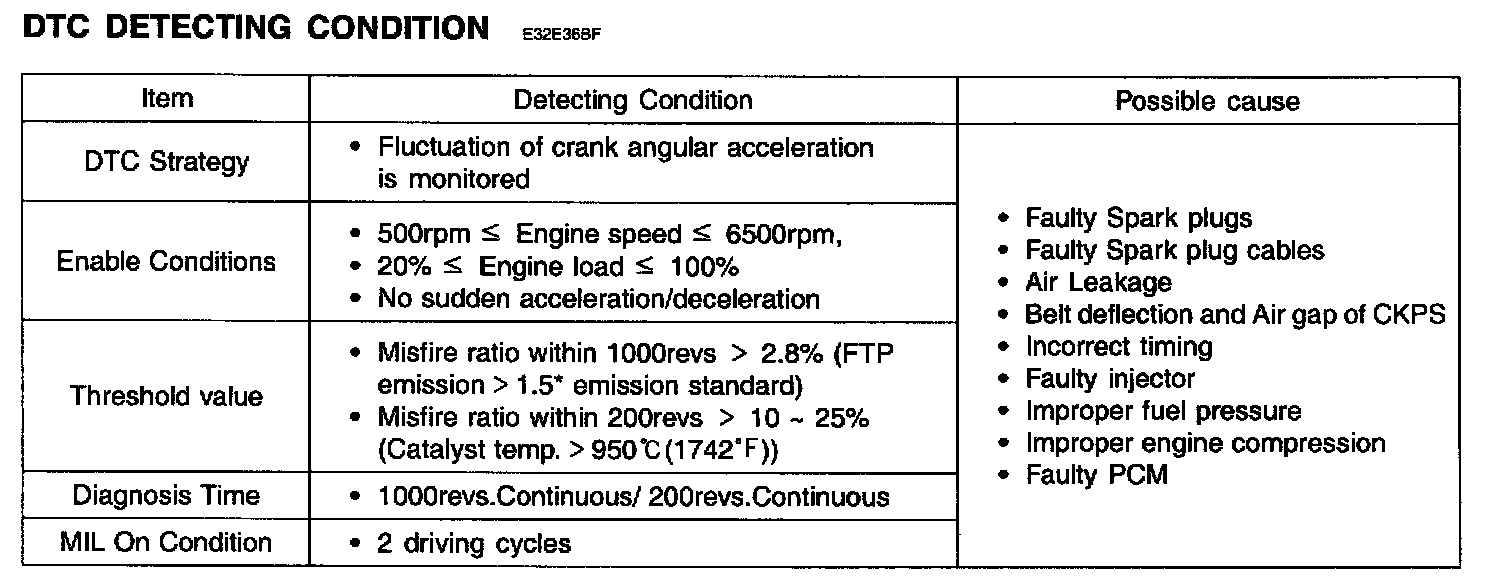 Misfires can be caused by lack of combustion in a cylinder due to absence of spark, poor fuel metering, poor compression, or many other causes. Even a small number of misfires may result in excessive exhaust emissions due to the unburned mixture. Increased misfire rates cause damage to the catalytic converter. The PCM monitors the crankshaft speed variation to determine if any misfiring generated. The PCM identifies the specific cylinder in which the misfire has occurred and counts individual misfire events by monitoring changes in the crankshaft rotation for each cylinder. A random misfire indicates two or more cylinders are misfiring.