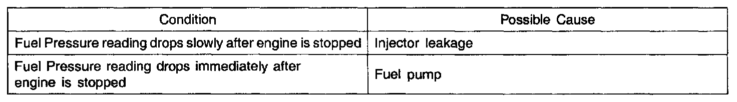 2. Stop the engine and check for a change in the fuel pressure gauge reading for 5 minutes.