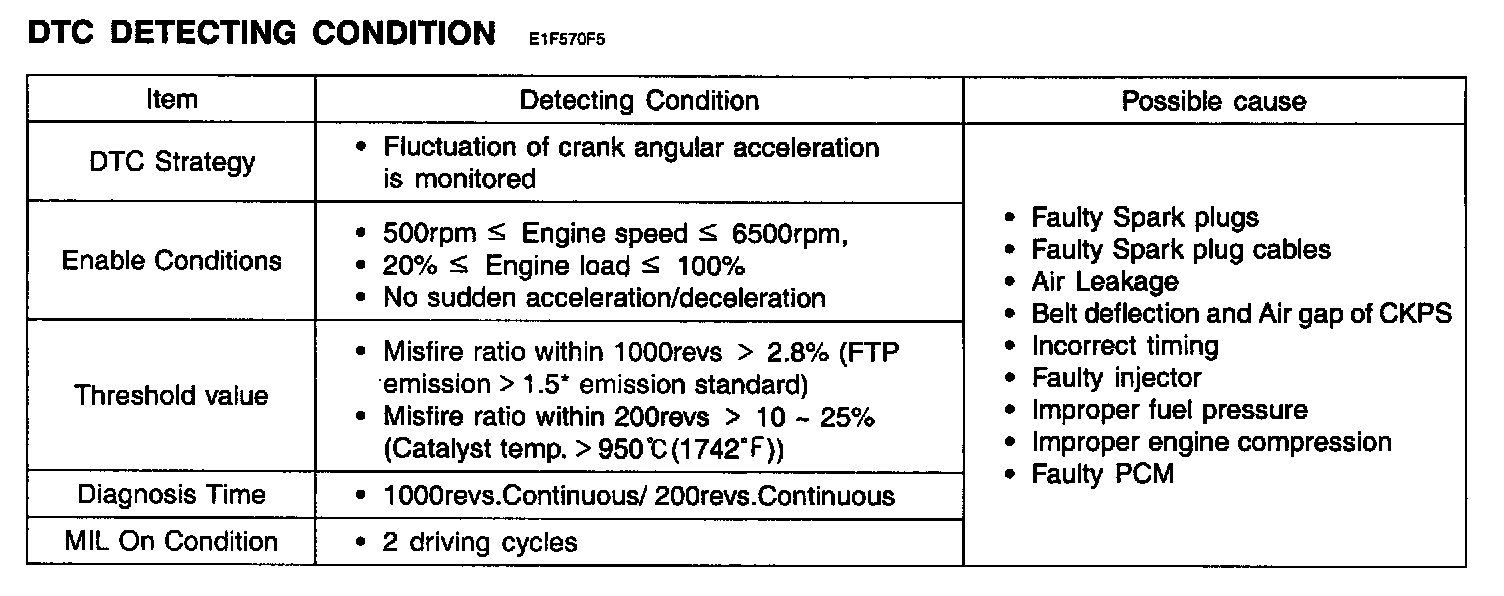 Misfires can be caused by lack of combustion in a cylinder due to absence of spark, poor fuel metering, poor compression, or many other causes. Even a small number of misfires may result in excessive exhaust emissions due to the unburned mixture. Increased misfire rates cause damage to the catalytic converter. The PCM monitors the crankshaft speed variation to determine if any misfiring generated. The PCM identifies the specific cylinder in which the misfire has occurred and counts individual misfire events by monitoring changes in the crankshaft rotation for each cylinder. A random misfire indicates two or more cylinders are misfiring.