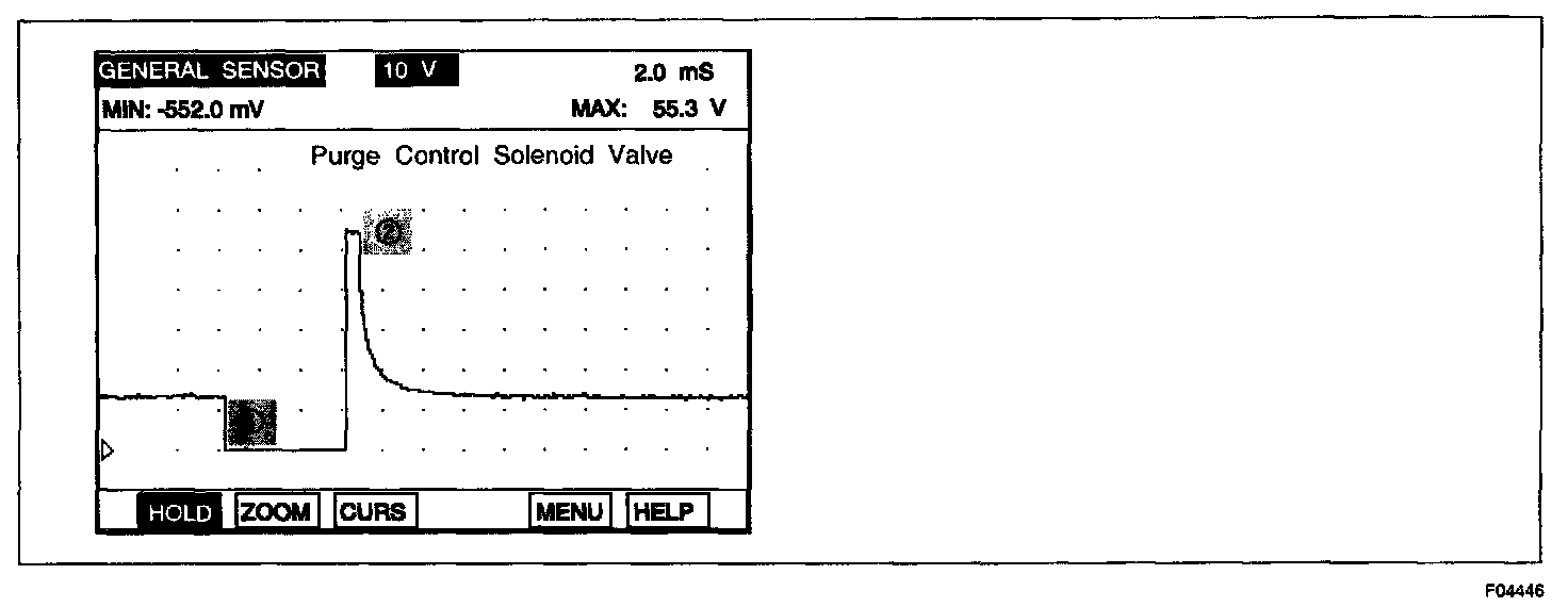 3. Monitor the CCV signal waveform and verify that the ground voltage is less than Approx. 0.3V (1) and the surge voltage (2) is between 40 V and 60 V.